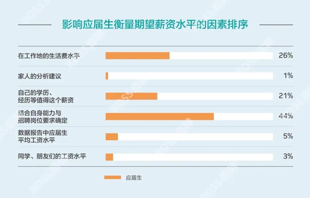 《2020应届生春招求职趋势报告》显示,2020年应届毕业生平均招聘薪资为5838元,而平均期望薪资高达6139元,存在着明显差异。从调研来看,44%的应届生表示会结合自身能力与岗位要求来确定自己的期望薪资,工作地的生活费水平是影响应届生确定期望薪资标准的重要影响因素。