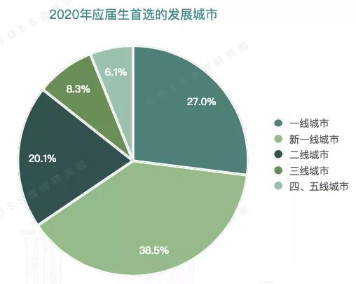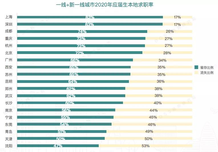 2020年春招季,新⼀线城市吸引了38.5%的应届⽣,较2019年同期再次提升,超出⼀线城市11.5个百分点。其中,杭州、成都、南京、长沙和西安五个新一线城市的新增应届生岗位最多。截至3月底,上海应届生的本地求职率达到83%,领跑全国,成都、重庆、杭州应届生的本地求职率位列新一线城市三甲。
