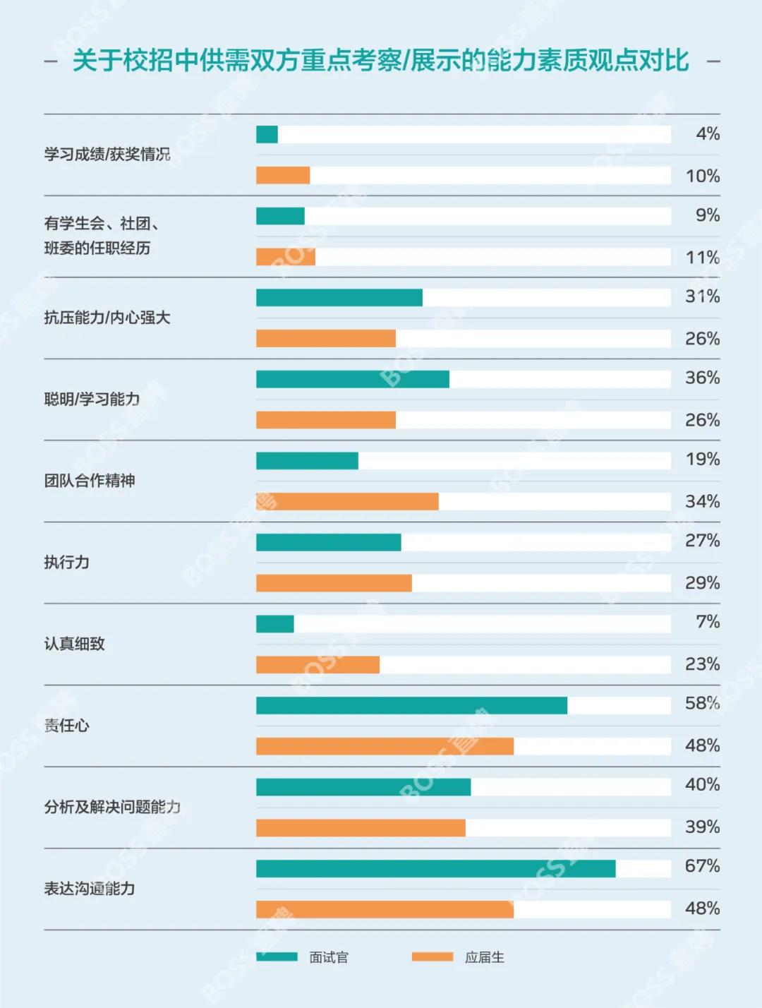 春招中人才供给双方的认知差异,除薪资水平外,在任职所需能力素养、能力展现方式等方面也有体现。调查结果显示,应届生与面试官双方均认为“表达能力”“责任心”“分析及解决问题能力”是企业最在意的三项能力素质。