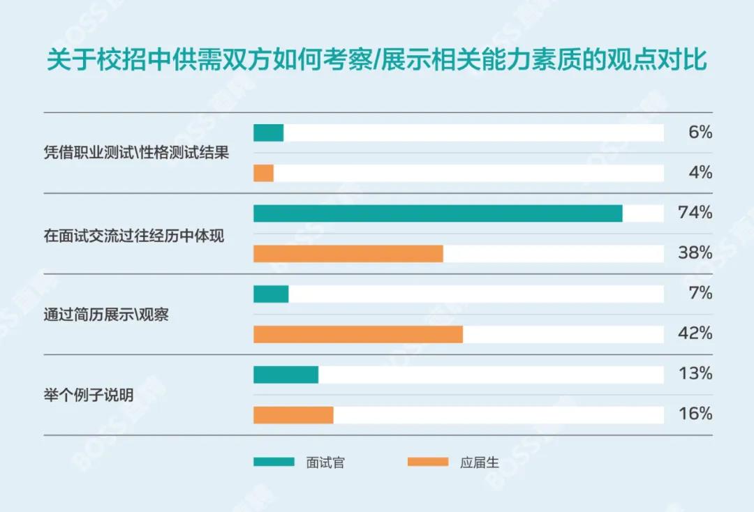 在调查中,我们观察到,大部分面试官与应届生都认可简历中“自我评价”阐述的价值。超过三成的面试官们更希望应届生能够在简历中举例说明,详细描述自己的优势。但会在简历中通过举例或其他形式客观佐证自己评价的应届生仅有9%,大多数毕业生仅仅做出了评价,并未意识到应该如何有效地在简历中展示自我。