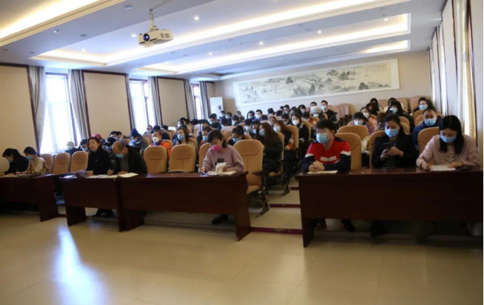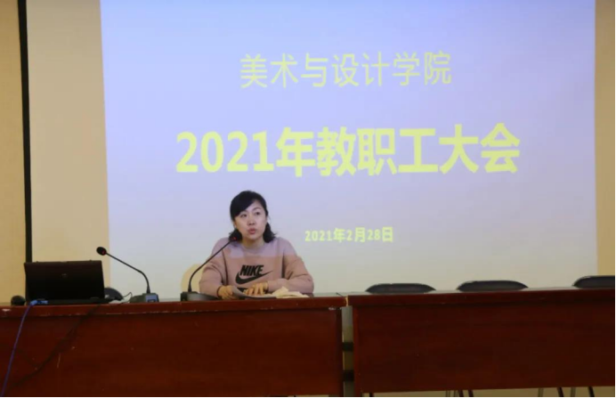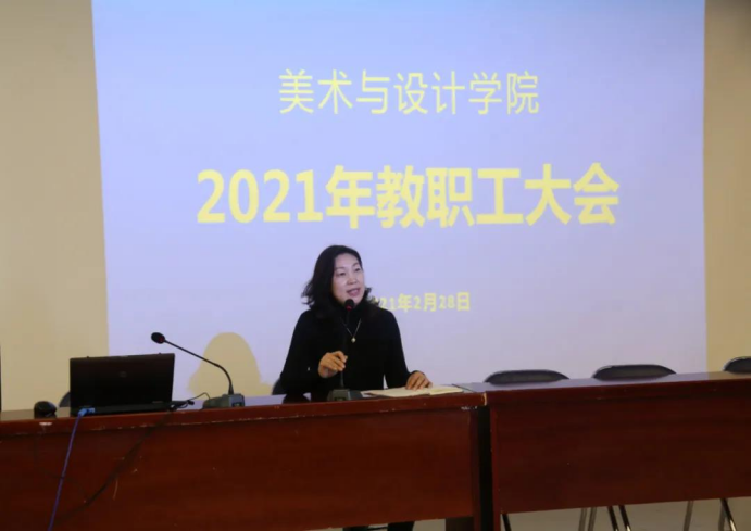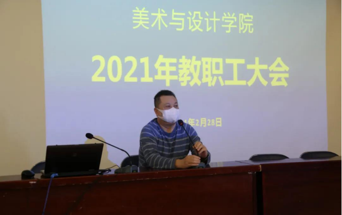 2021年2月28日,美术与设计学召开第一次全体教职工大会。美术与设计学院院长戚锋、党总支书记胡颖、副院长解辉、副书记丛永柱与全体教职工共同回顾春节期间的疫情防控工作,并对疫情防控形势下新学期各项工作进行布置。