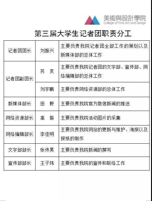 此次换届选举活动,主要推选出第三届大学生记者团领导成员,加强大学生记者团工作纪律,提高干部队伍素质,协调各部门工作关系,为美院新一阶段的宣传工作奠定了坚实的基础。