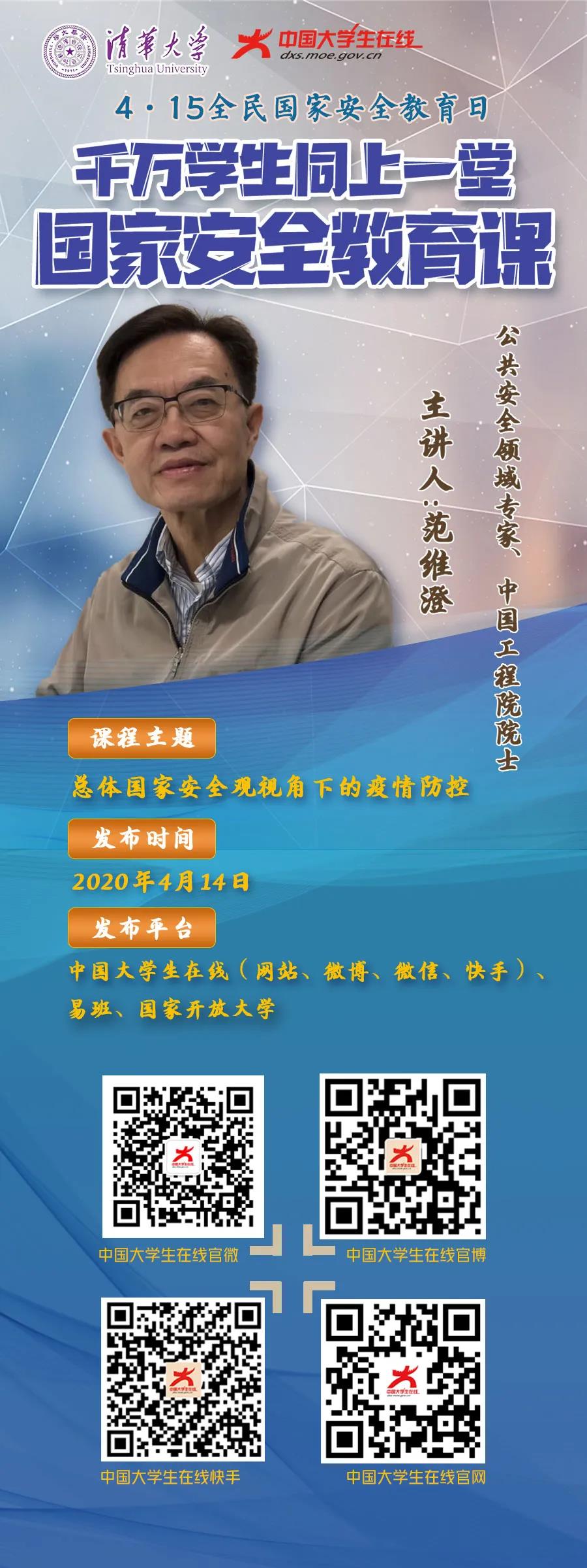 千万学生同上一堂国家安全教育课!公共安全领域专家、中国工程院院士范维澄为全国大学生讲授《总体国家安全观视角下的疫情防控》。课程上线时间4月14日,敬请期待!