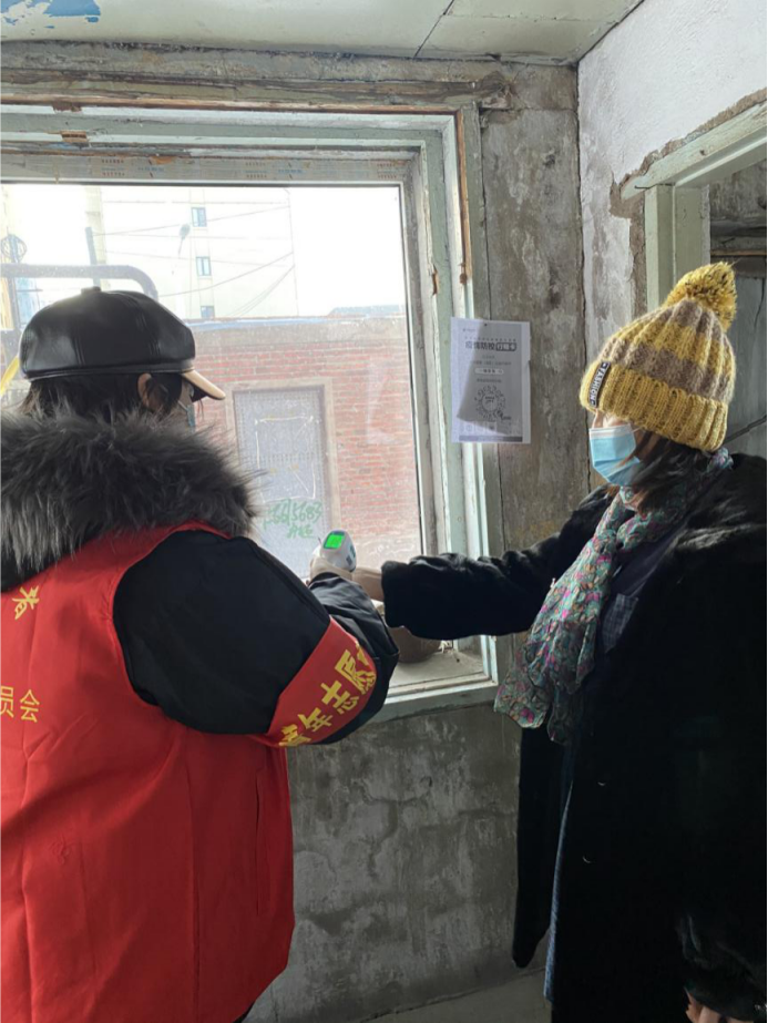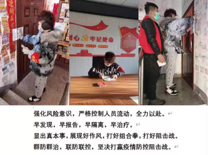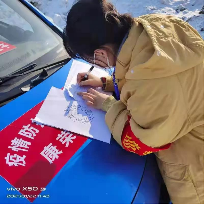 2018级视觉传达专业王欣同学,主动宣传防疫知识,动员社区人员配合防控。面对严寒,为了能够准确掌握每一名外地返乡人员信息,她们依旧仔细填写信息不漏一人。为当地防疫工作注入了新活力。