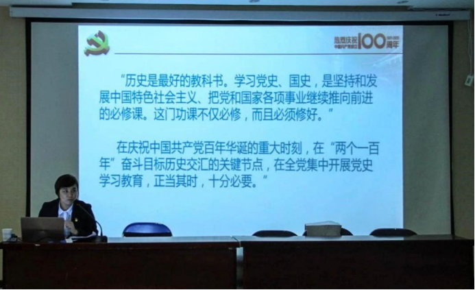 胡颖书记代表美院党总支发言,她首先传达了黑河学院党委书记王刚同志在全校党史教育启动仪式上的讲话精神,然后介绍了美院党史教育活动的主题方案,对方案中的具体活动内容进行了详细解读,同时提出了党史教育活动开展的工作要求。她指出,一定要在党史工作中注重学习和宣传,务必把握好政治理论学习的科学性和正确性,要树立正确的政治导向,要强化基层党组织领导,要最大限度地发动广大群众做到全员参与,同时要精心部署、周密安排,扎实为广大师生办好实事。