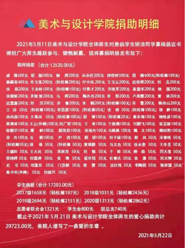 得知矫洁同学的情况后,学院领导班子高度重视,辅导员胡楠老师配合其家长办理休学手续,为其查找入学保险,联系保险公司;美术与设计学院师生关心关怀矫洁同学的病情,帮助矫洁同学与其家人树立坚定的信心,保持乐观的心态,并积极响应号召向有困难的同学施以援手,一时间,爱心之风吹遍校园。学院师生汇聚爱心,凝聚力量,我院已为矫洁同学捐款29723元人民币,其中教师捐款12520元人民币,学生捐款17203元人民币。一笔笔捐款不仅仅是爱心的传递,更是美术与设计学院师生的团结一心,同舟共济的精神力量。
