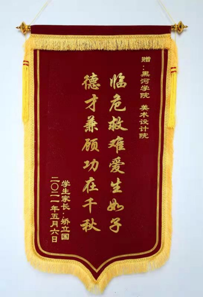 近日,黑河学院美术与设计学院获赠了这样一面锦旗:临危救难爱生如子,德才兼备功在千秋。鲜红的锦旗承载了满怀的感恩之情,这是我院罹患白血病学生矫洁的家长送来的衷心感谢。病魔可以夺去人的健康,却不能夺去人间真情。