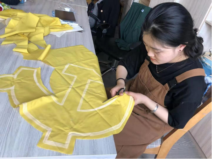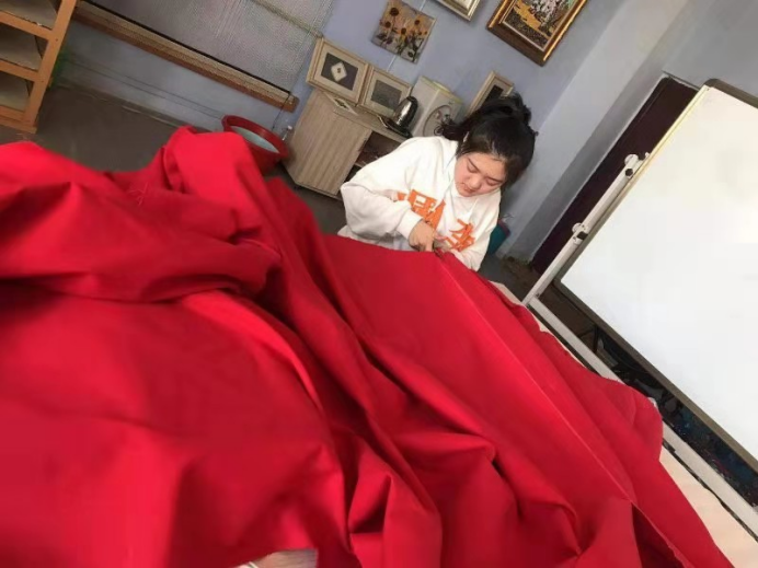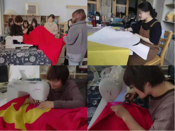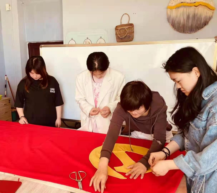 选用料、绘底样、走针线……,边疆学子跟随老师聆听党旗的制作流程、学习党旗的制作方法,剪裁缝纫,用最传统、最朴实的方式表达着对党的诚挚热爱和祝福。