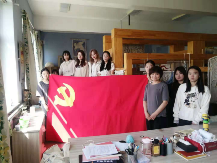 “中国共产党成立于1921年,中国共产党党旗为旗面缀有金黄色党徽图案的红旗,是中国共产党的象征和标志。这面飘扬了百年的旗帜,伴随中国共产党走过了百年的风雨征程……”,4月初,在美术与设计学院纤维艺术工作室里,指导教师、基层党支部书记王玉云带领青年学生、大学生入党积极分子们一边讲授党史知识、一边绘制党旗,师生们一针一线,把爱党、敬党、颂党之情融进亲手绘制的党旗中。