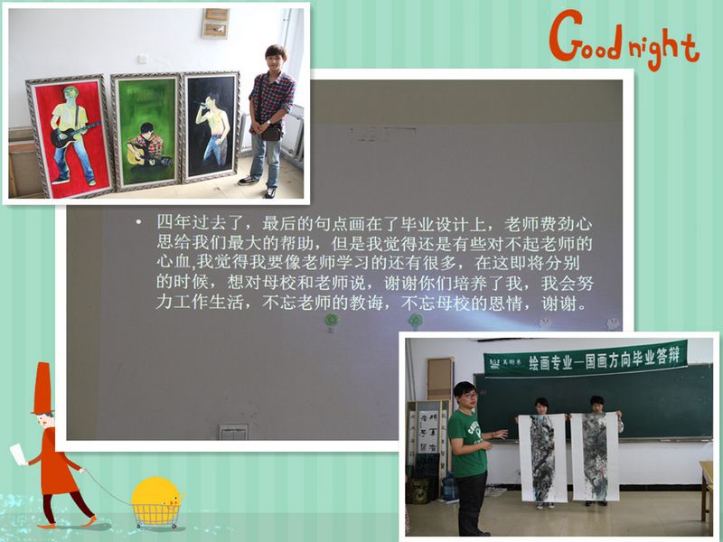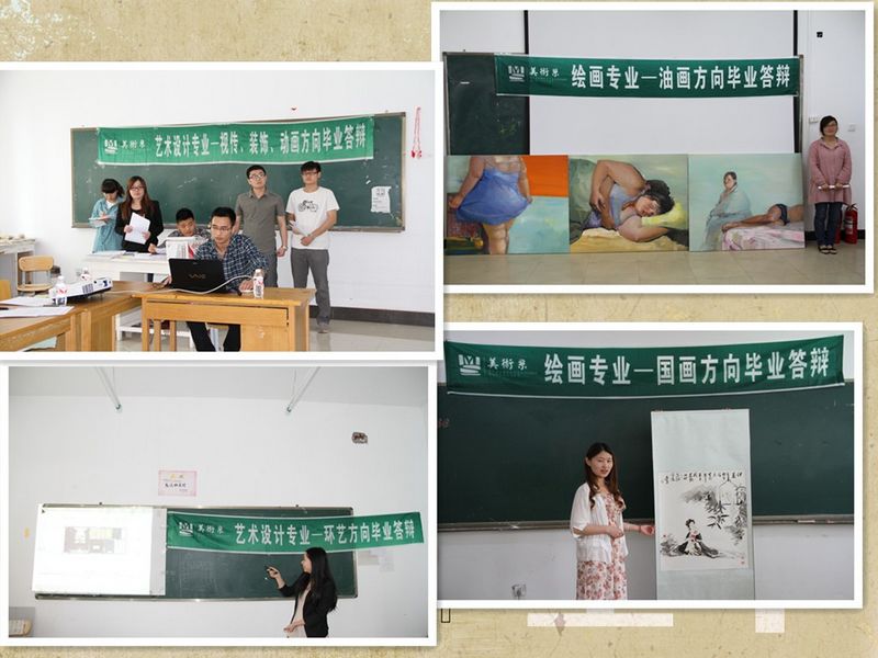 在为期二天的答辩工作中,各答辩小组严格按照学院关于毕业论文有关规定的文件要求,认真、负责地完成本次论文答辩工作。本次答辩过程主要分为学生答辩陈述、评审老师提问和学生回答问题三个部分。国画、油画专业以口述创作过程并结合作品展示的形式进行答辩,艺术设计环艺、视传、动画、装饰专业方向以ppt课件展示的形式进行陈述答辩,答辩形式专业特色突出。每位同学在简短、精要的阐述作品和论文的创作内容后,评审老师就学生的回答和整个论文立论观点、专业知识、表述能力等方面进行综合评价,并指出了进一步研究的方向和具体的修改意见。