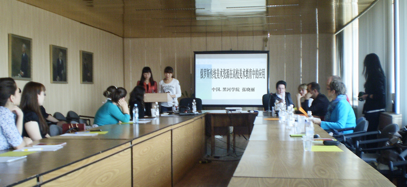 为加强学术交流,提高科研水平,美术系科研秘书张晓丽、理论教研室主任逯红梅、翻译索雪于近期应邀参加2012年4月27日由俄罗斯联邦科学教育部、国家高等教育预算机构“阿穆尔州州立大学”共同主办,在阿穆尔州布拉戈维申斯克市举办的“当代社会与文化空间中的艺术与技术” 国际科学与实践会议,张晓丽在会上做了关于“俄罗斯传统美术资源在高校美术教育中的应用”的报告并和与会代表进行学术问题交流,得到广泛好评。