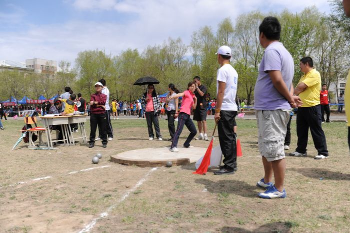 美术系教工代表队李粉老师在铅球赛场上奋力一搏