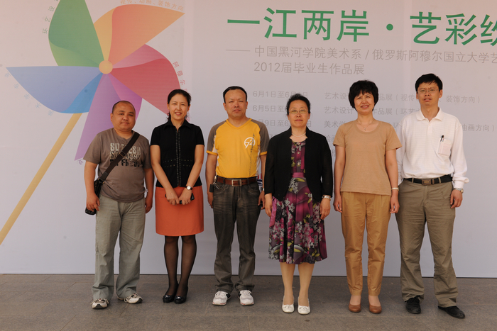《一江两岸.艺彩纷呈》黑河学院美术系.俄罗斯阿穆尔国立大学艺术设计系2012届毕业生优秀作品汇报展于6月1日上午十点在美术系展厅隆重开幕。学院党委书记曲伟建、学院副院长杨宏、哈巴罗夫斯克国立文化艺术学院校长谢尔盖亲临现场参观指导。美术系主任葛淑君、书记姜丽萍、副主任戚锋出席了开幕式。