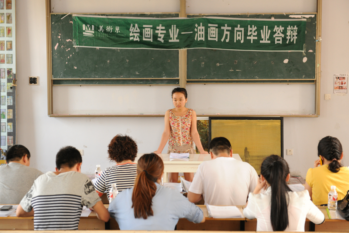 在为期三天的答辩工作中,各答辩小组严格按照学院关于毕业论文有关规定的文件要求,认真、负责地完成本次论文答辩工作。本次答辩过程主要分为学生答辩陈述、评审老师提问和学生回答问题三个部分。美术学专业以口述陈述形式进行答辩,艺术设计专业以ppt课件展示的形式进行陈述答辩,国画、油画专业为口述创作过程并结合作品展示的形式进行答辩,答辩形式专业特色突出。每位同学在简短、精要的阐述作品和论文的创作内容后,评审老师就学生的回答和整个论文立论观点、专业知识、表述能力等方面进行综合评价,并指出了进一步研究的方向和具体的修改意见。