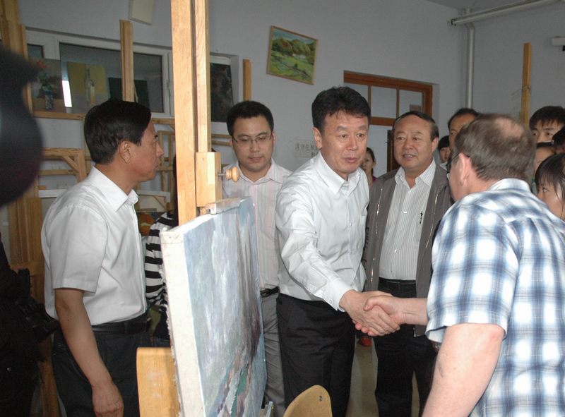 国家人力资源与社会保障部副部长、国家外国专家局局长张建国与美术系外教瓦佳宁亲切握手交谈