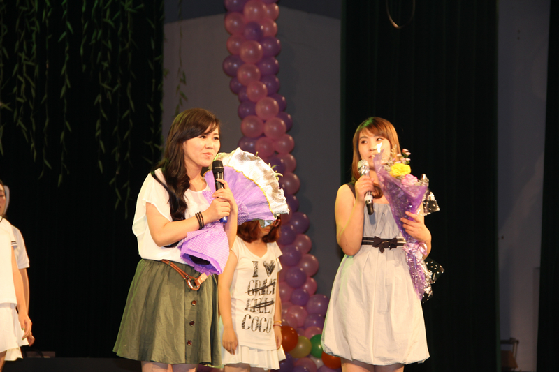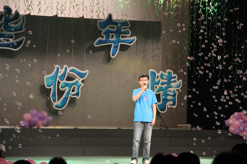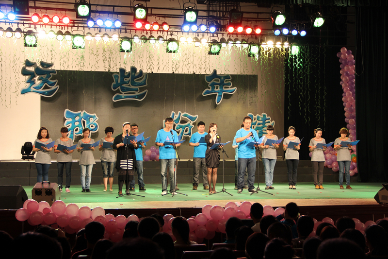 08级毕业生辅导员杨艳彦在晚会现场和同学们一同演唱歌曲《启程》