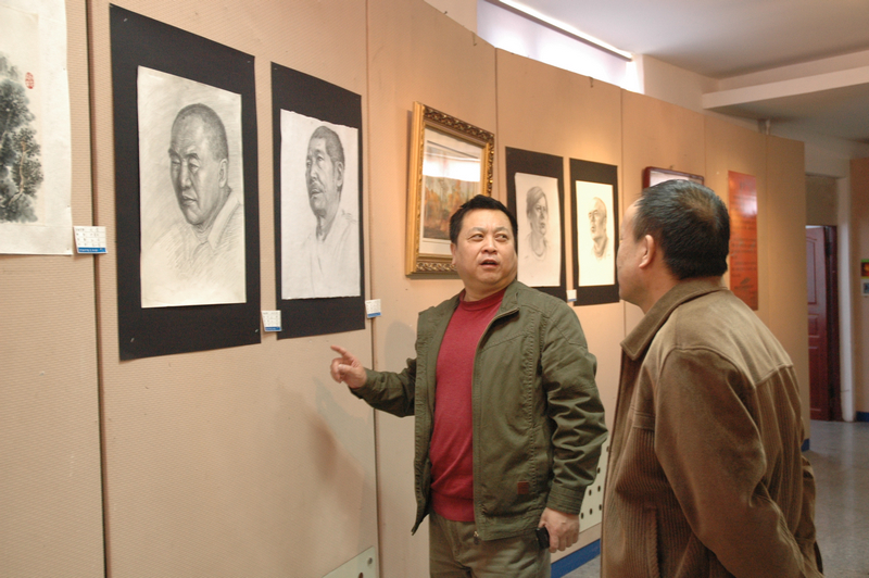 美术系副主任戚锋在作品展上与高国华老师研讨