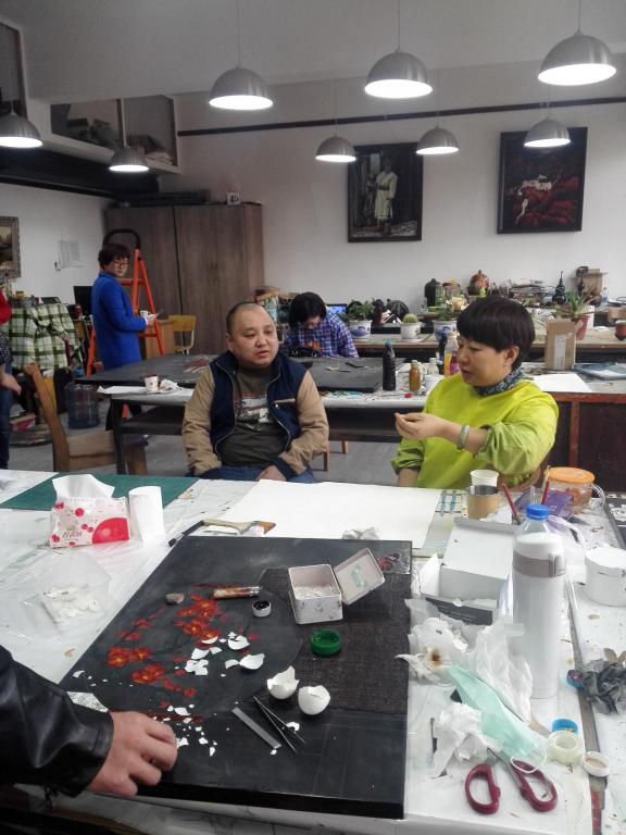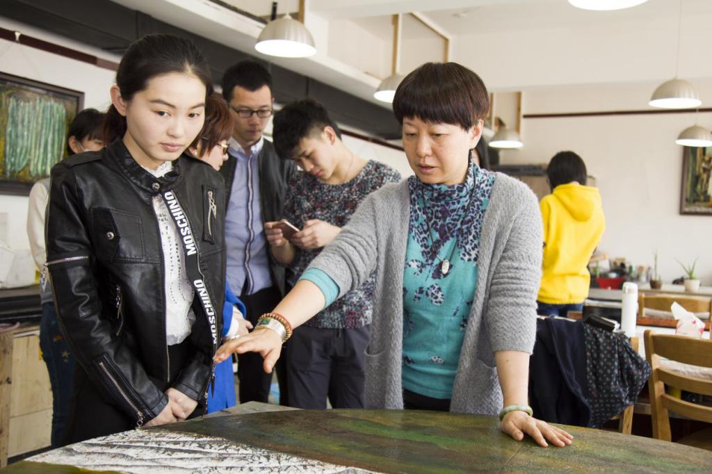 上午八点,美术学院艺术与设计系主任王玉云、漆画教师袁绪鹏以及漆画创作的学生们一起在实践中心漆画工作室与魏宁老师漆画创作的交流与学习,魏老师从漆画理论、创作理念、取材、技法以及其他方面为我们亲自指导,师生们受益匪浅。