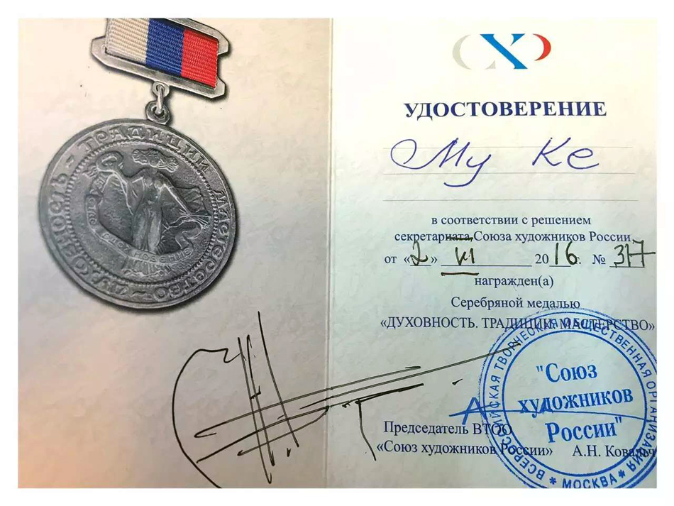 俄罗斯联邦美术家协会第一书记巴拉夫斯科伊向牟克颁发俄罗斯联邦美术家协会银质勋章和证书