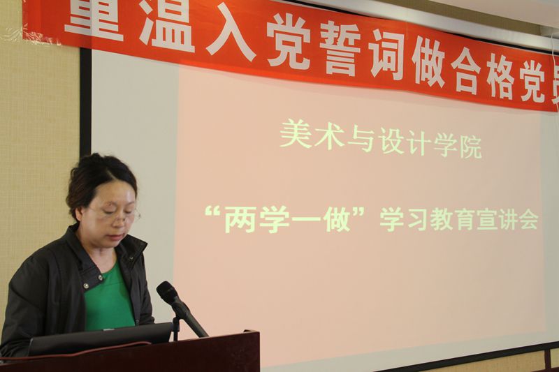 2016年6月15日,美术与设计学院党总支在禹舜报告厅举办了“两学一做”学习教育活动,活动由三个部分组成,分别是重温入党誓词、做合格党员签名、葛淑君院长做《贯彻从严治党要求狠抓“两学一做”落实》专题讲座,我院教工党员参加了本次学习。