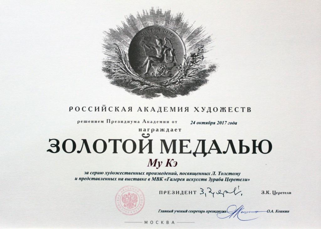 牟克的《纪念列夫·托尔斯泰—战争与和平》系列作品于2017年4月在莫斯科展出,经过俄罗斯艺术科学院主席专家团的评审,最终获得这一代表俄罗斯艺术科学院最高荣誉的奖项。俄联邦艺术科学院院长、著名雕塑家祖拉布·采列捷利亲自为牟克颁发了俄罗斯联邦艺术科学院金质奖章。
