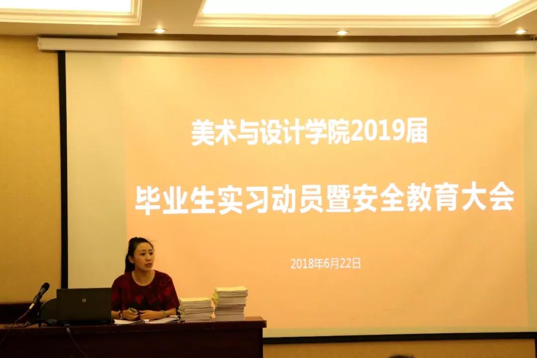 2018年6月22日下午一点,美术与设计学院2019届毕业生实习动员暨安全教育大会于美阶三教室召开。15级辅导员邵倩老师带领2019届全体毕业生参加此次会议活动。