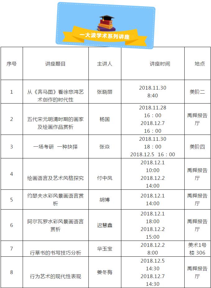 为拓宽美术系各专业方向学生的知识视野,提升学生专业学习水平,促进教育教学质量的进一步提升。美术系计划在2018年11月26——12月10日期间,组织各专业教师着重从绘画艺术语言、艺术理论、教育教学实践能力、硕士研究生入学考试复习等角度开展系列专题讲座。希望美术系学生能从以上讲座中获取知识和启示,以梦为马,不负韶华!