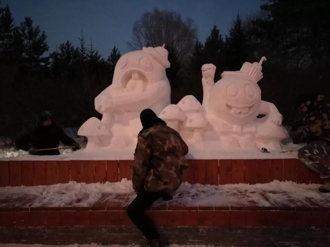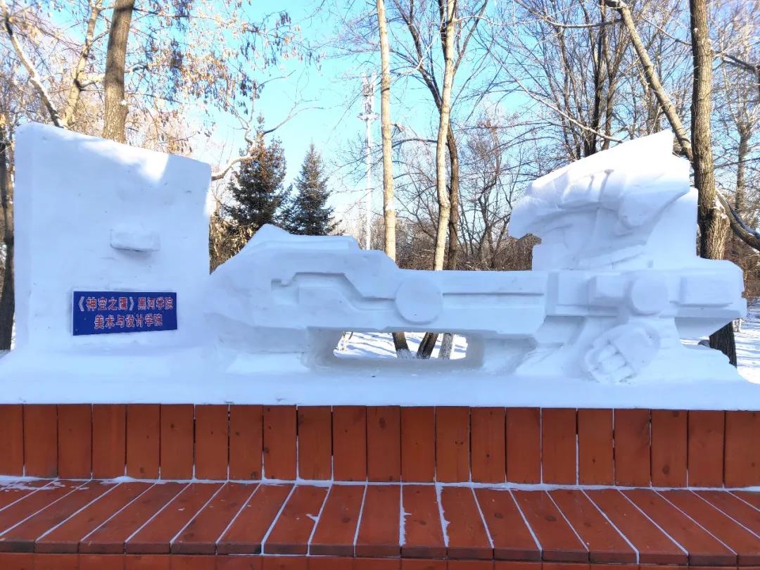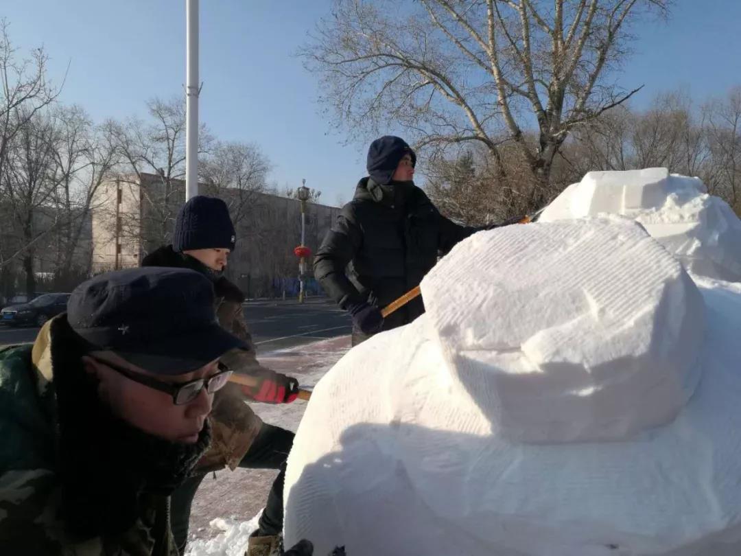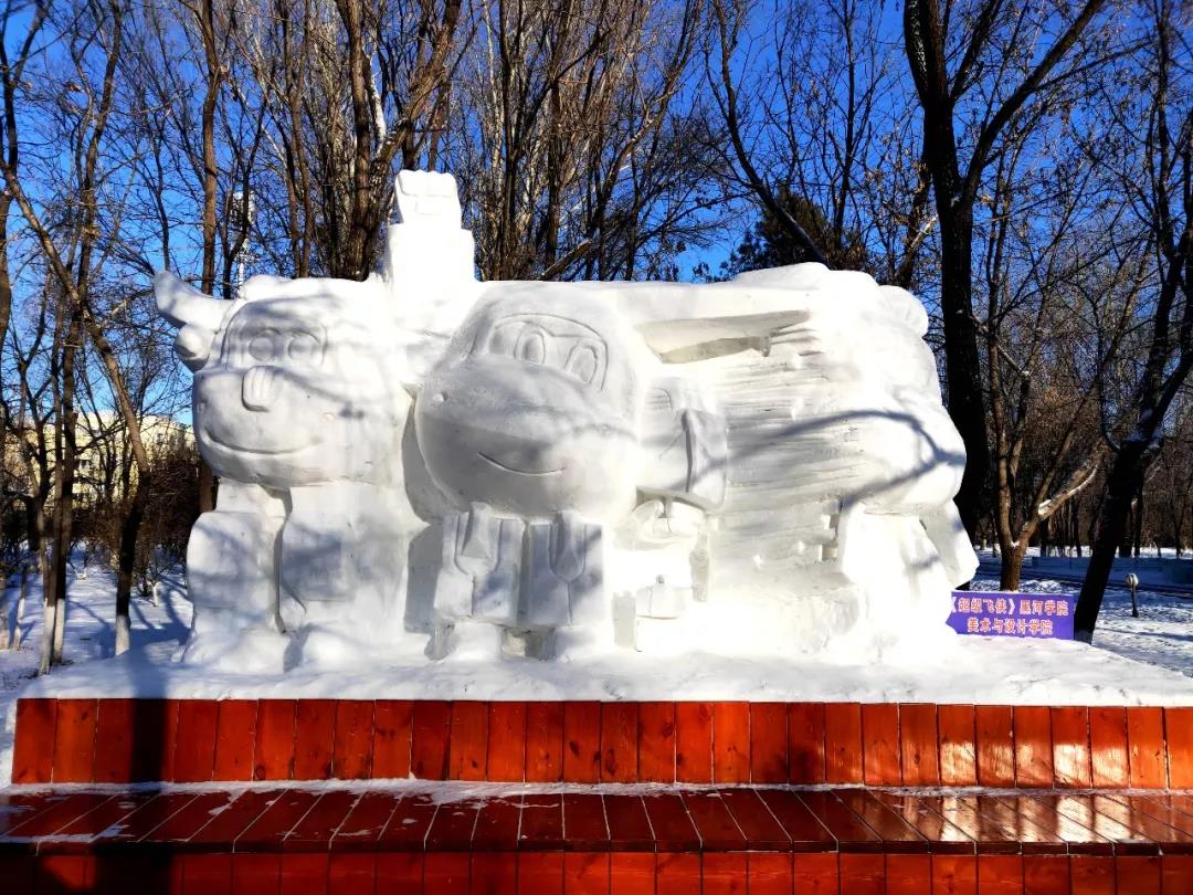 本次比赛历时四天,由美术与设计学院教师黄剑、王奇分别带领学生一起完成了三组作品:分别名为《超级飞侠》、《神空之鹰》、《疯狂的小糖》,创作完成的作品立于黑龙江畔,以动画卡通人物形象打破了黑河冬季漫长严寒的凝重,增加了城市的灵动,方便市民欣赏与拍照,彰显了边疆高校办学的青春活力,寄予了黑河人民对冰雪文化蓬勃发展的美好愿望。评奖结果预计一月初揭晓,在此,祝愿黑河学院师生雪雕作品能取得理想的成绩!