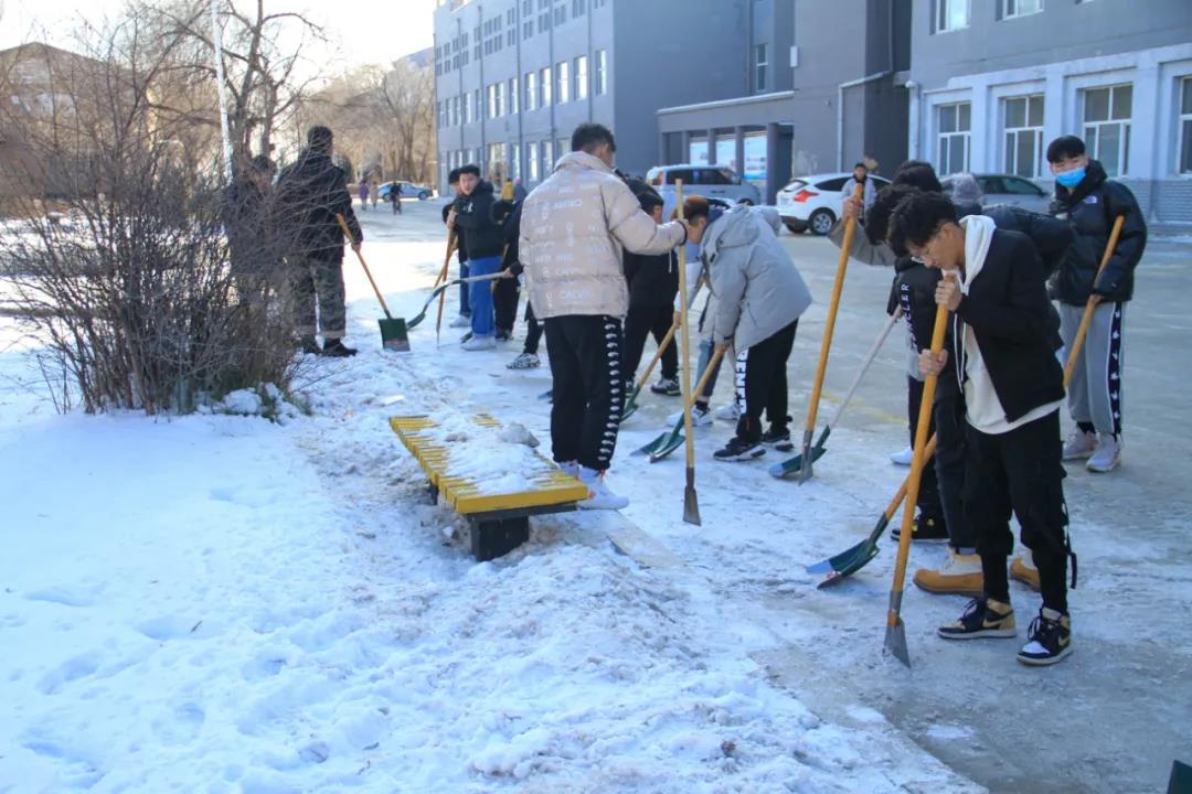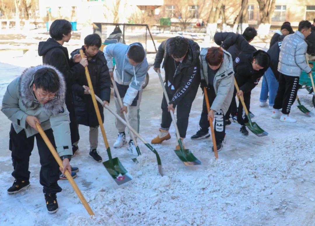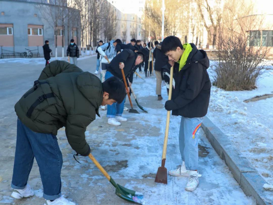 虽然入冬非常寒冷,有的地方的积雪也因碾压而非常坚固,但学生干部们齐心协力,劲往一处使,一个人不行两个人一起,利用铁锹等工具与积雪较量,把一个一个拦路虎都铲了下来。
