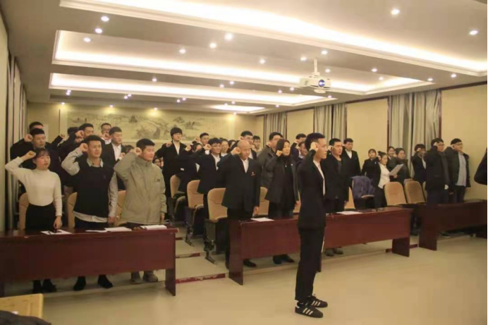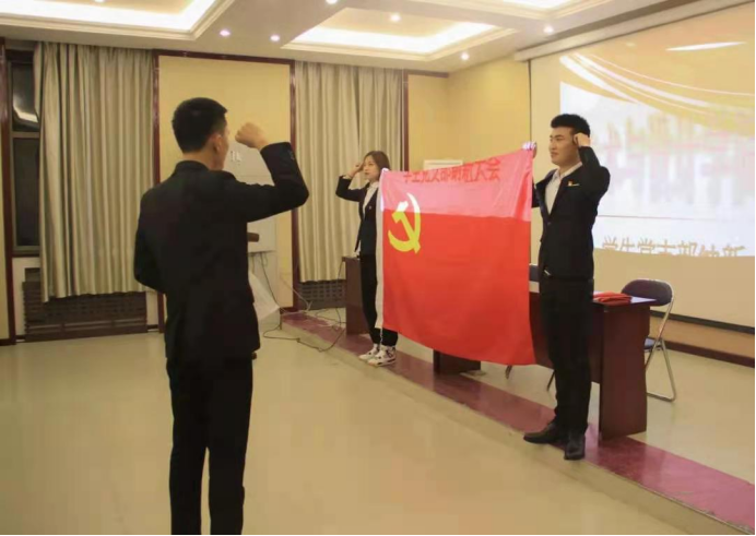 仪式在雄壮的国际歌中拉开帷幕,全体党员面对党旗郑重宣誓。