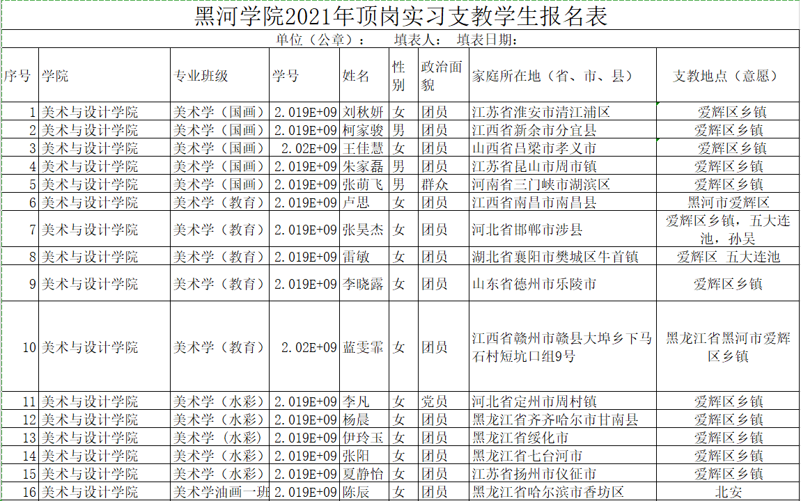 黑河学院2021年顶岗实习支教学生报名表