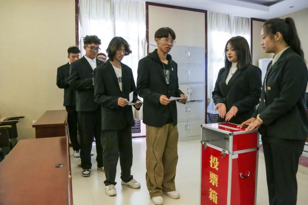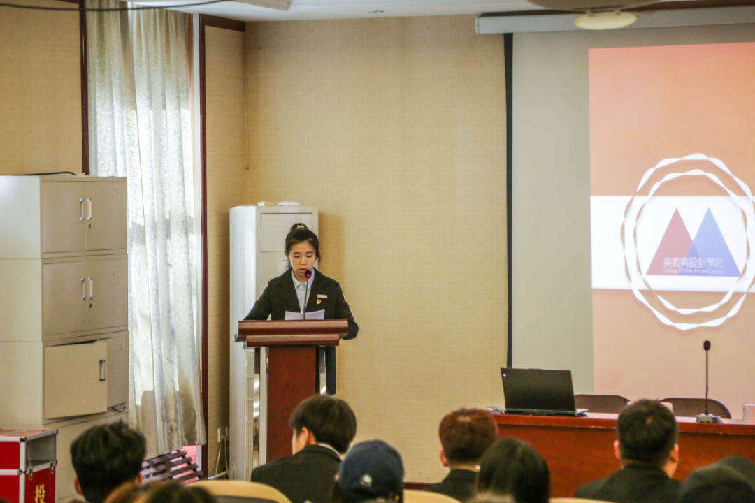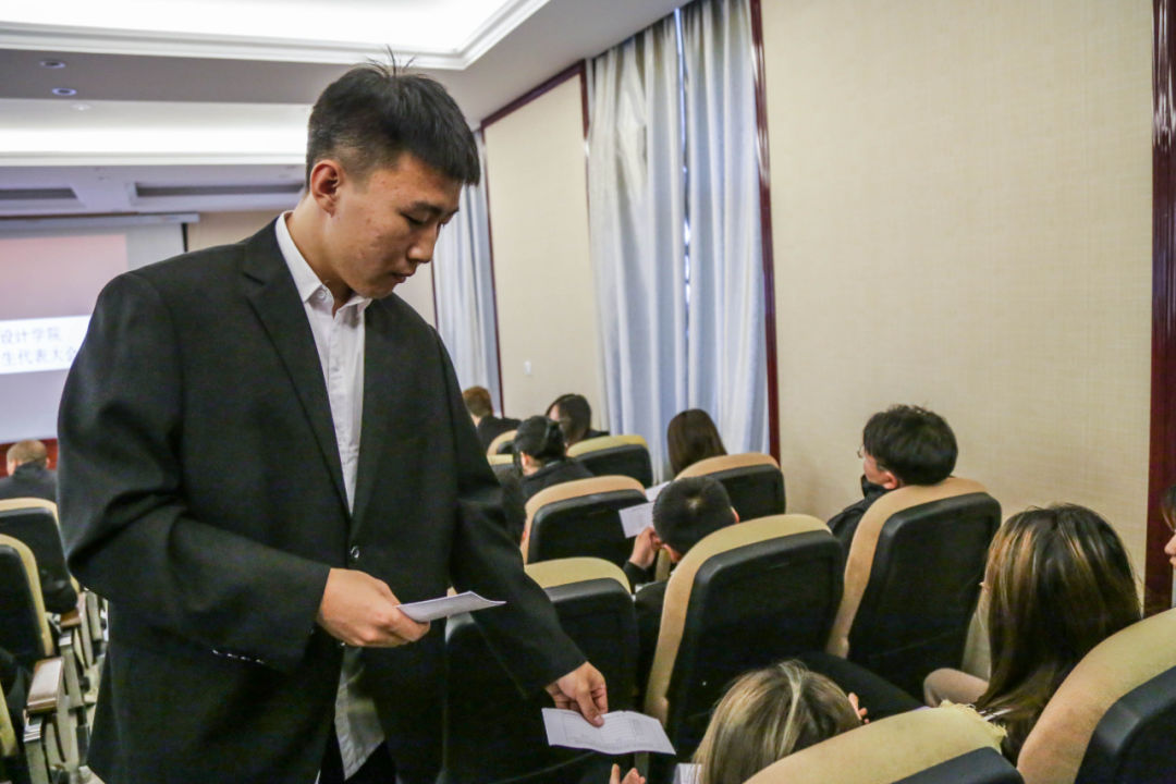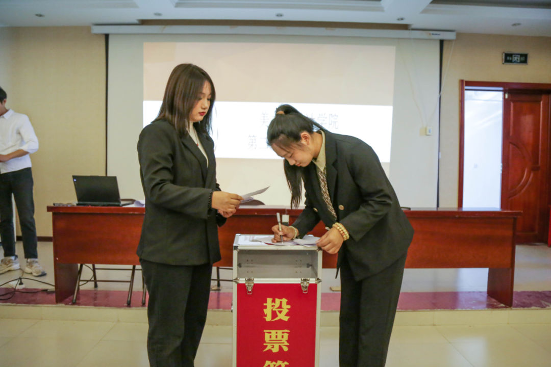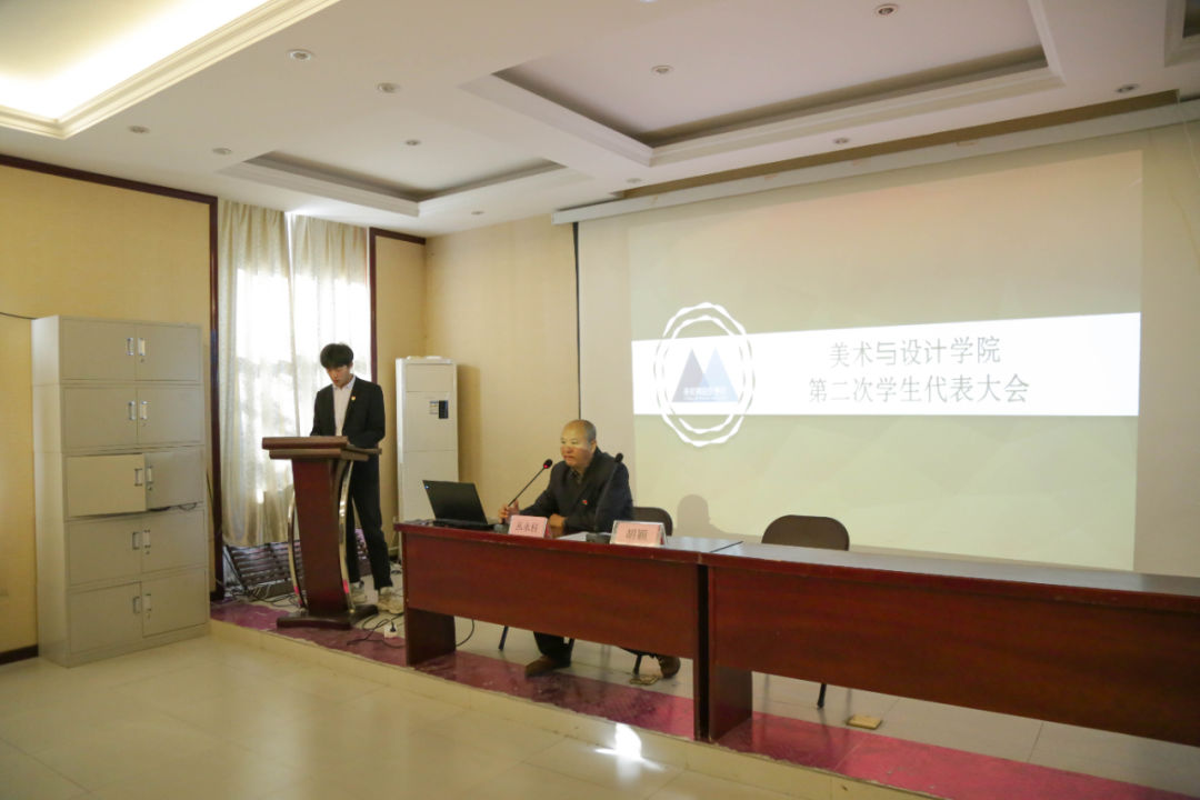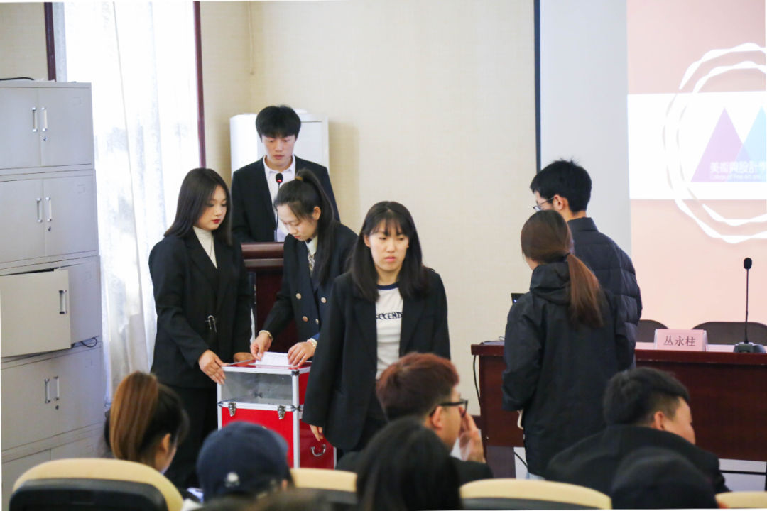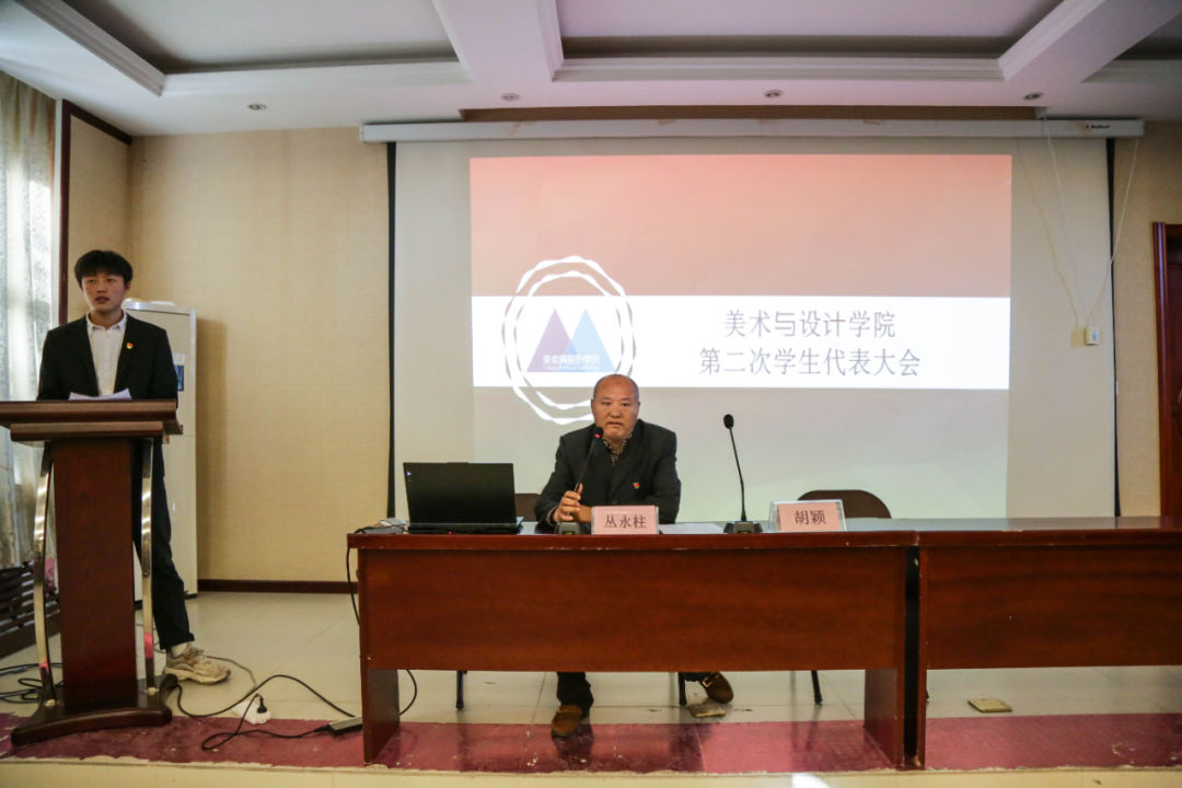 大会进行第五项:选举并宣布美术与设计学院25届学生会主席团成员名单,大会进行第六项,公布第25届学生会主席团选举投票结果。大会进行第七项,美术与设计学院副书记丛永柱发布致辞,表明了对全体学生的殷切期望,希望全体学生代表能够以身作则,认真学习,有意义的度过四年大学生活,为自己美好人生气坚持不懈的奋斗,为全体学生做出了重要指导。