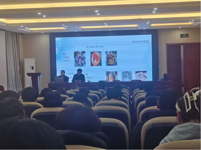 从企业发展历程出发,嘉宾介绍了公司如何深耕传统工艺领域,将葫芦彩绘、火绘烙画、卡通文玩等传统技艺与现代美学创意融合,打造出兼具文化价值与市场吸引力的产品。现场展示的精美工艺作品,让同学们直观感受到传统工艺在当代语境下的创新表达,每一件作品都在诉说着“传统不守旧,创新不离根”的工艺发展理念。