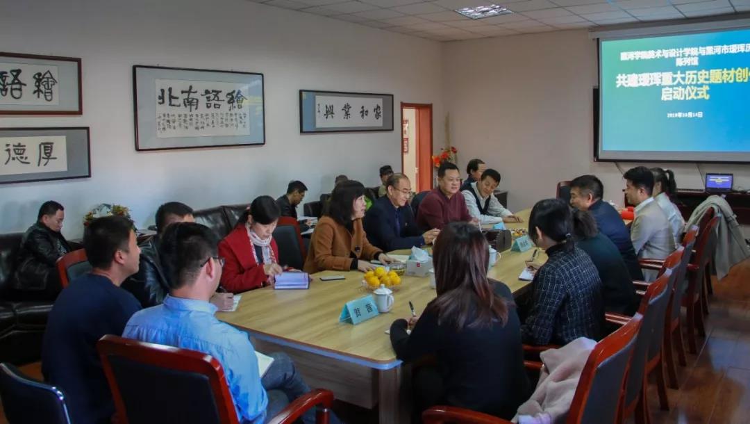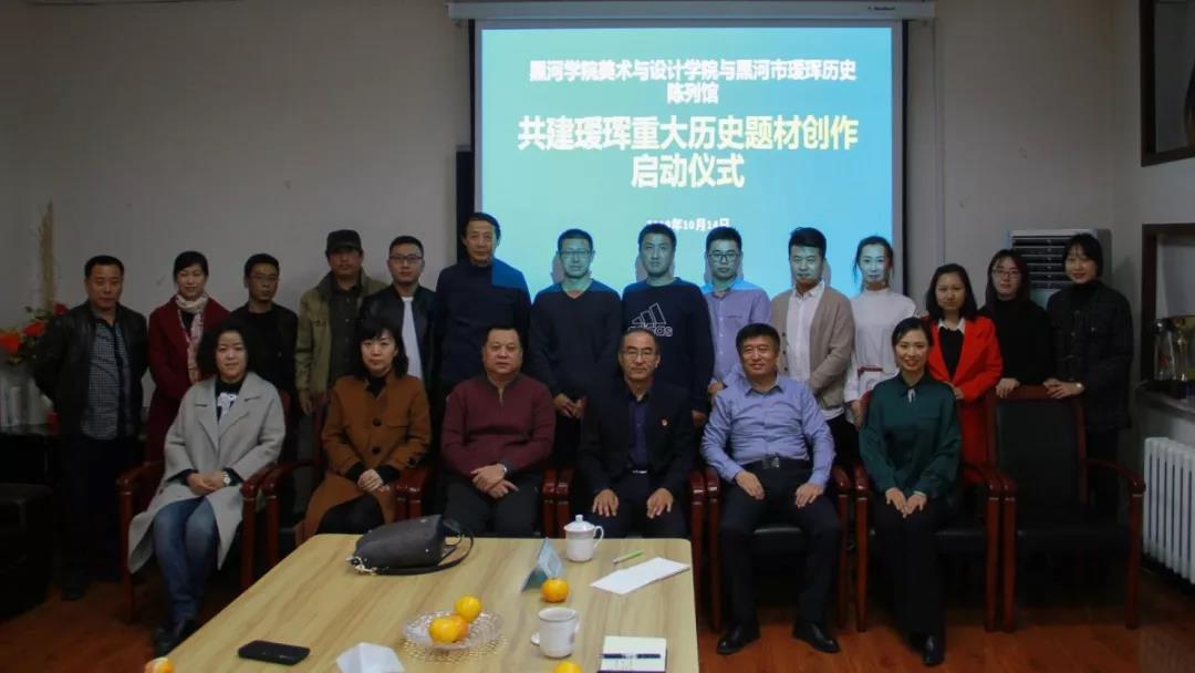 2019年10月14日,黑河学院美术与设计学院举办瑷珲历史陈列馆共建重大历史题材创作启动仪式,黑河学院副校长许海深、瑷珲历史陈列馆馆长陈会学、美术与设计学院院长戚锋以及绘画专业教师、瑷珲历史陈列馆相关人员出席启动仪式。
